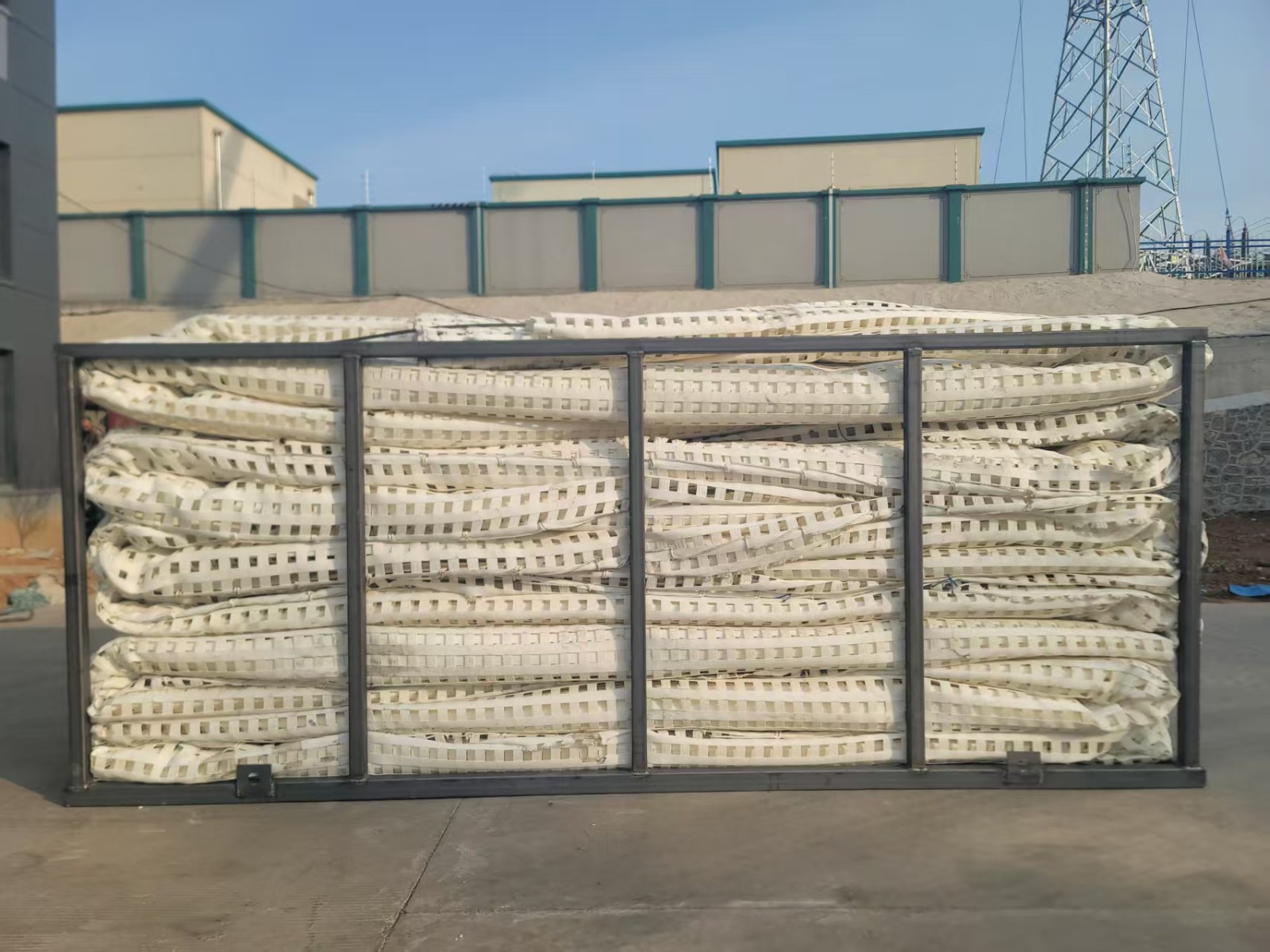 该发明新材料产品是采用一种高强、高模工业聚酯纤维长丝,通过一种经编技术编织成网状基体。